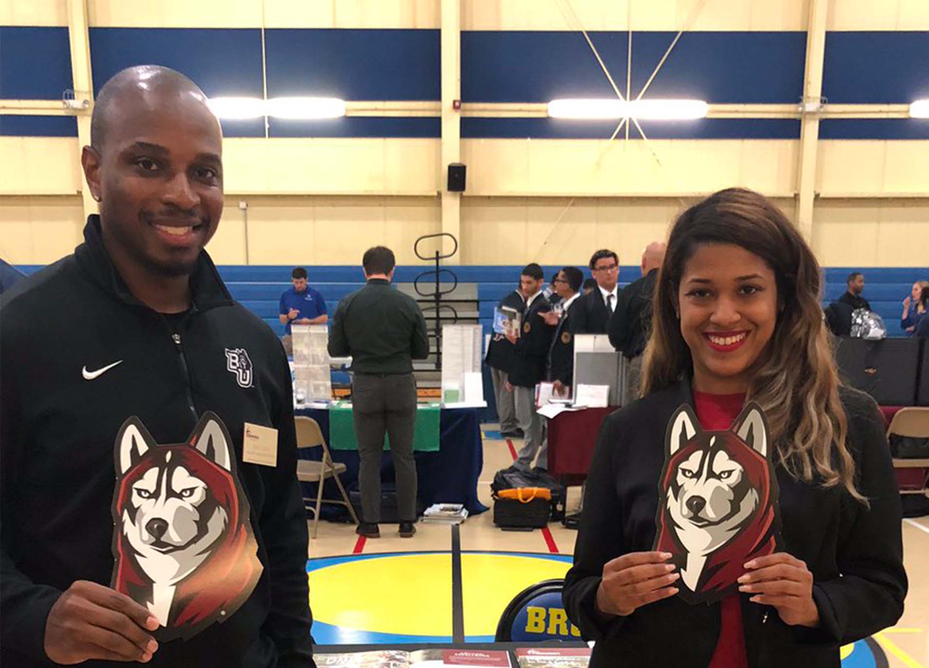 Bloomsburg professor and student sit in front of monitors at an on-campus media editing station