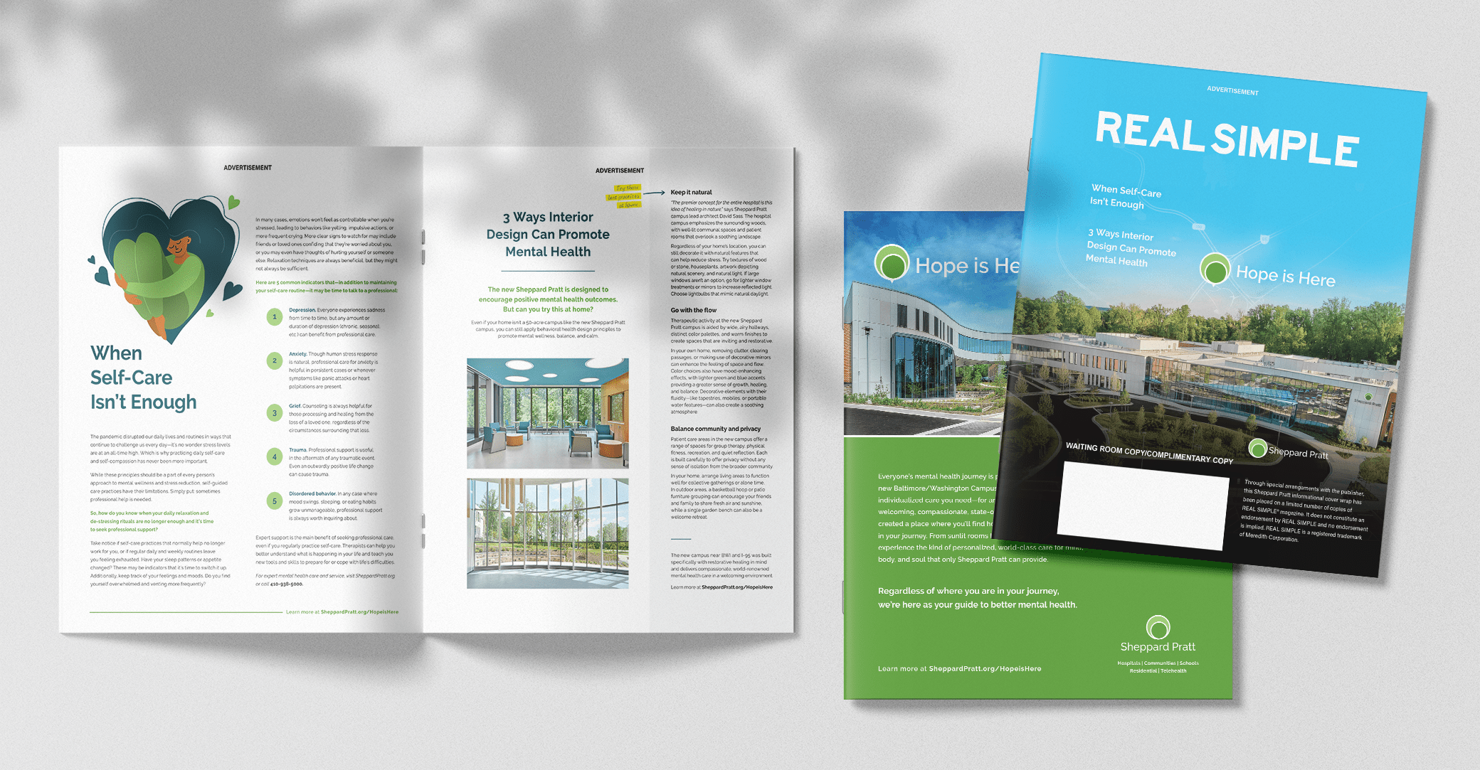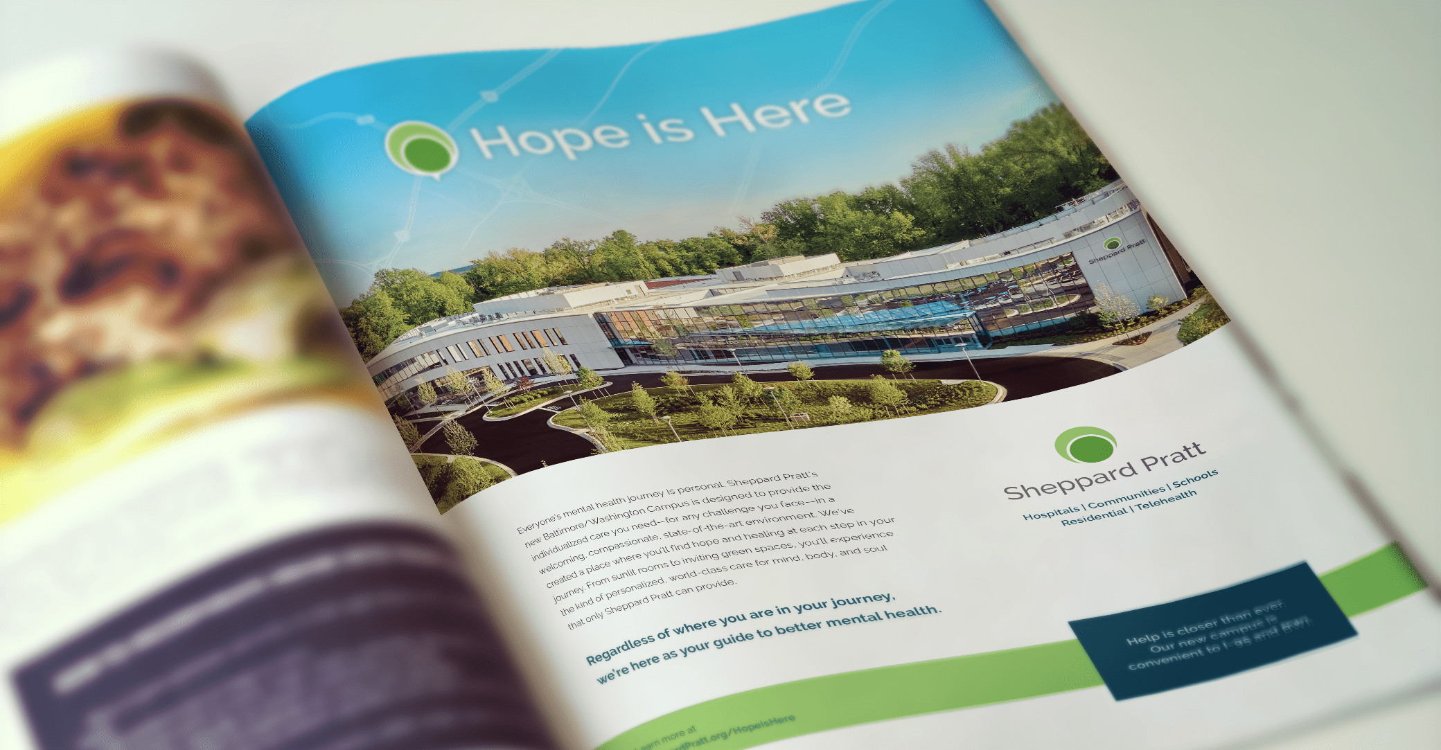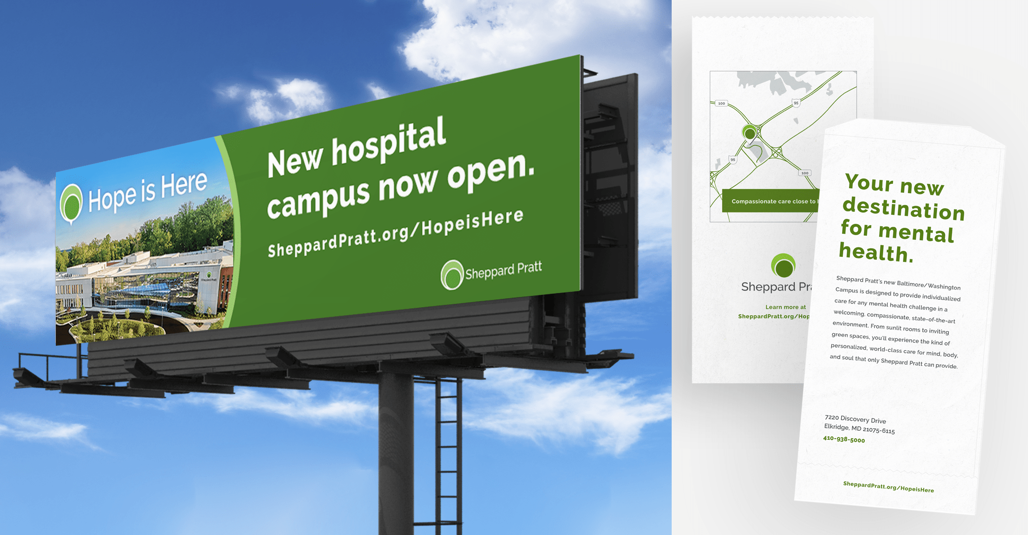 The “Hope is Here” campaign encapsulated the positive emotional component of the Baltimore/Washington campus with a dual meaning: Sheppard Pratt is where people can find help, and a new facility is here to provide compassionate care.