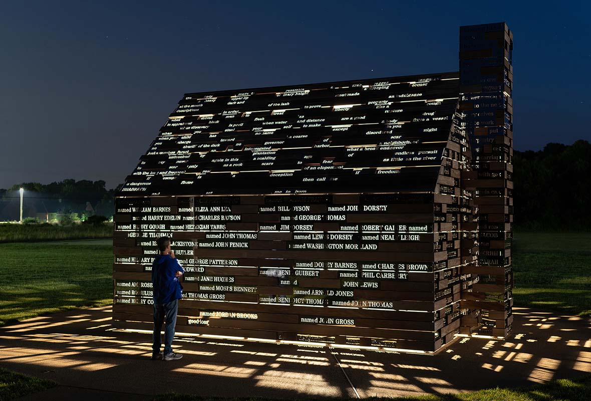 Poet Quenton Baker drew upon actual slave advertisements and runaway slave notices from Southern Maryland to create the redacted words of erasure poetry etched onto the exterior of the Commemorative the College constructed.